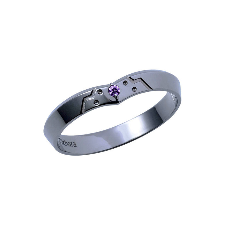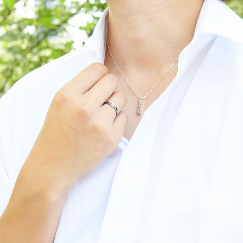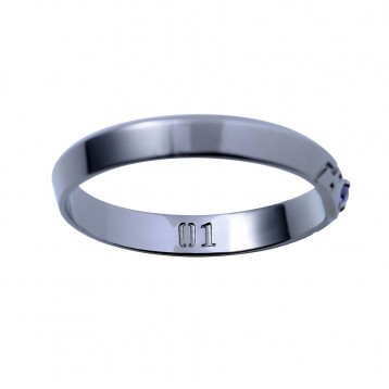 エヴァ初号機の胸部からデザインを取り込み、中央には機体メインカラーのストーンをセット。機体をイメージしたブラックコーティングで仕上げました。内側には機体番号を刻印。